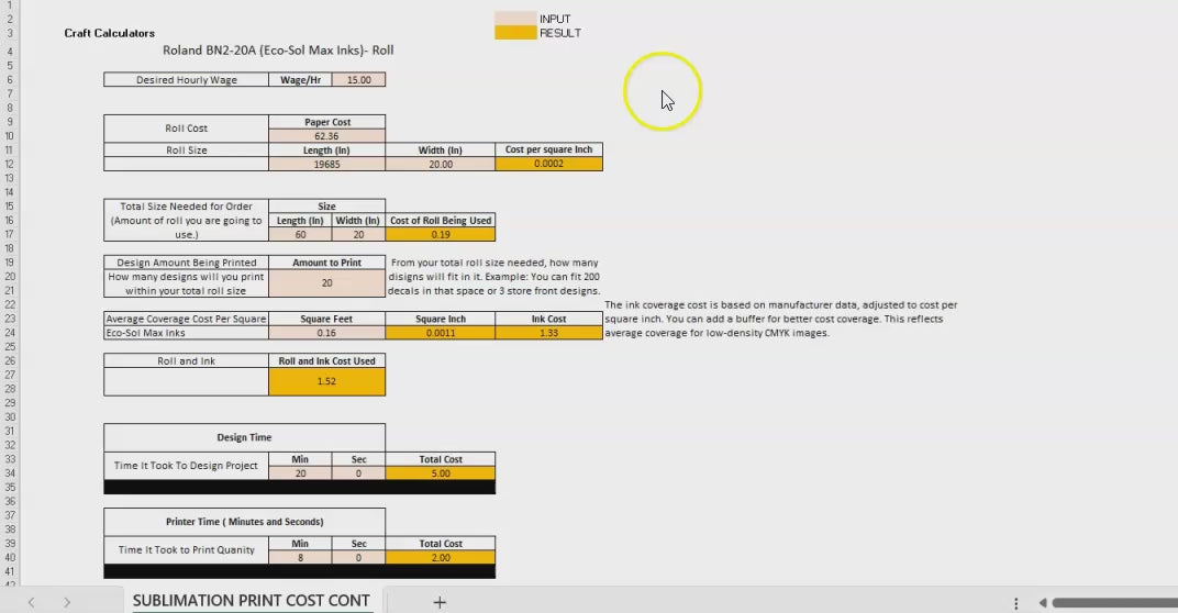 Sublimation Design Cost | Contour Cutting | Ink Cost Calculator Spreadsheet