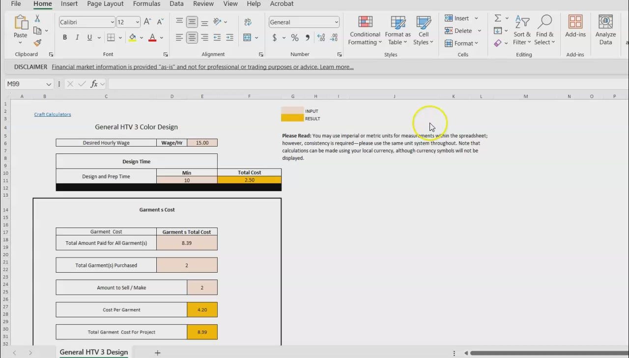 This calculator is designed to calculate the cost to make a 1 to 3 color heat transfer vinyl (HTV) products or projects. Simply input all your production information, such as material and labor costs, and the calculator will provide the cost to make your HTV designs. It’s perfect for those who need an accurate estimate for single or multi-color vinyl projects.