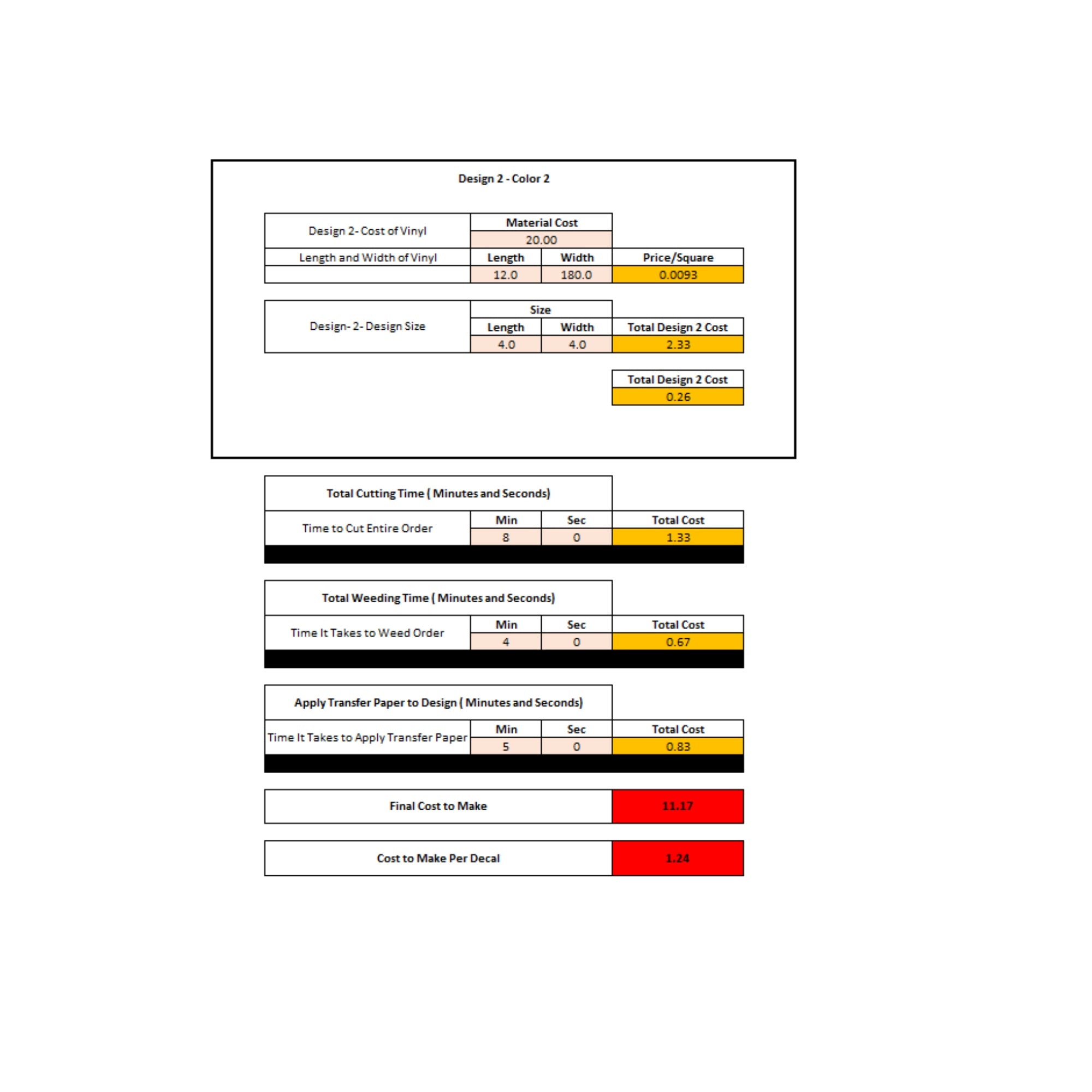 Get precise cost-to-make pricing for multi-color vinyl decals, whether you’re producing just one or many. This calculator is tailored for 3-color vinyl designs, taking into account essential elements like design time cost, plotting, weeding, and applying transfer paper for each color layer. You’ll receive the final cost to make for the entire project and the individual cost to make per decal.