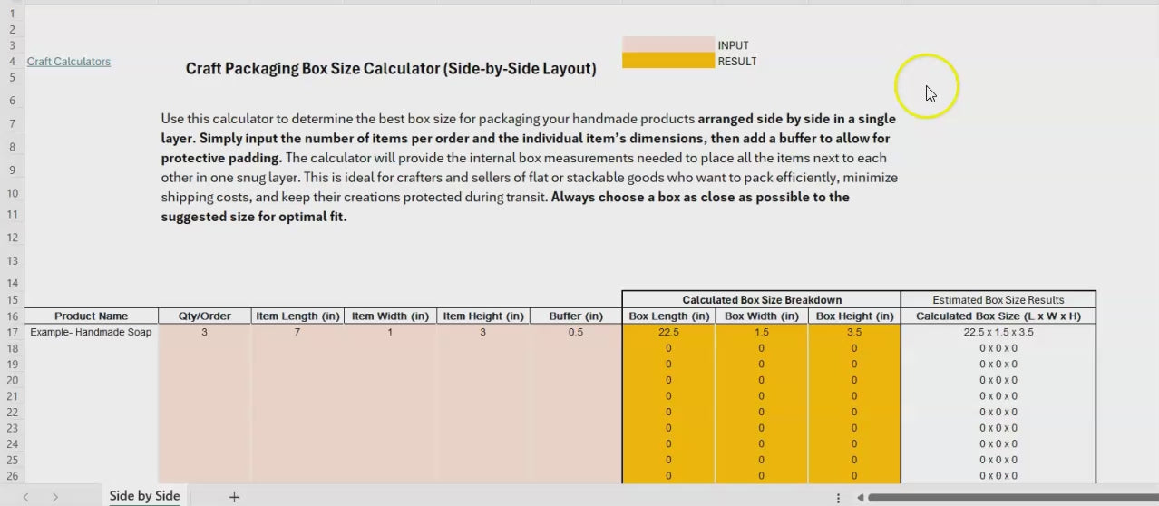 Craft Packaging Box Size Calculator (Side-by-Side Layout) helps you determine the optimal box dimensions for packaging multiple craft products in a side-by-side arrangement, ensuring efficient use of space while maintaining product safety. With this calculator, you can: