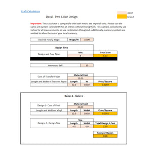 Get precise cost-to-make pricing for 2-color vinyl decals, whether you're producing one or many. This calculator is tailored for two-color vinyl designs and factors in elements such as design time cost, plotting, weeding for both colors, and applying transfer paper to the design. You will receive the final cost to make for the entire project as well as the cost per decal.