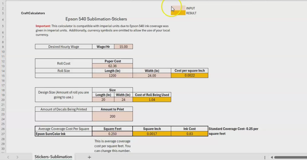 Epson 540 Stickers and Decals Calculator helps you determine the product cost for sticker and decal projects using the Epson 540 printer with rolls, based on accurate ink and material calculations. With this calculator, you can: