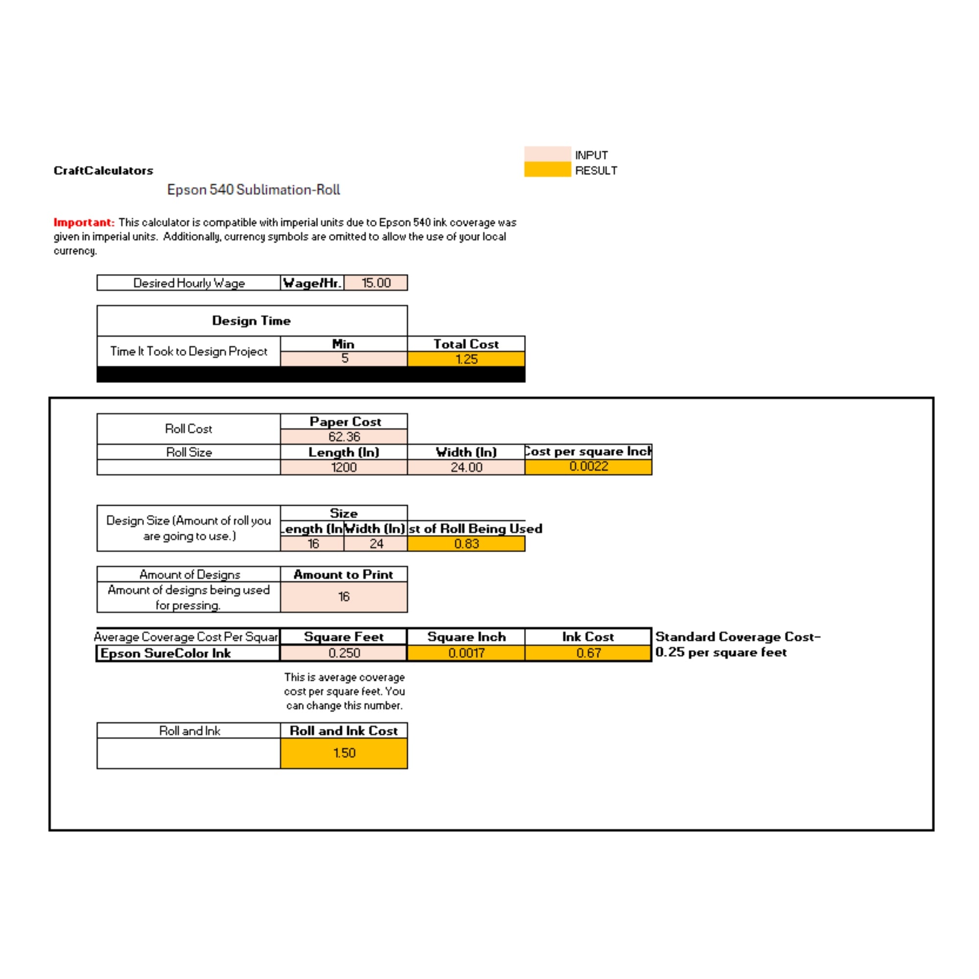 Epson 540 Sublimation Calculator (Rolls) | Product Cost & Ink Paper Usage Tool