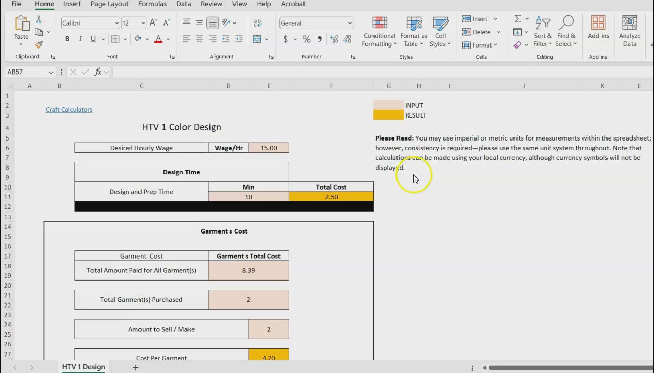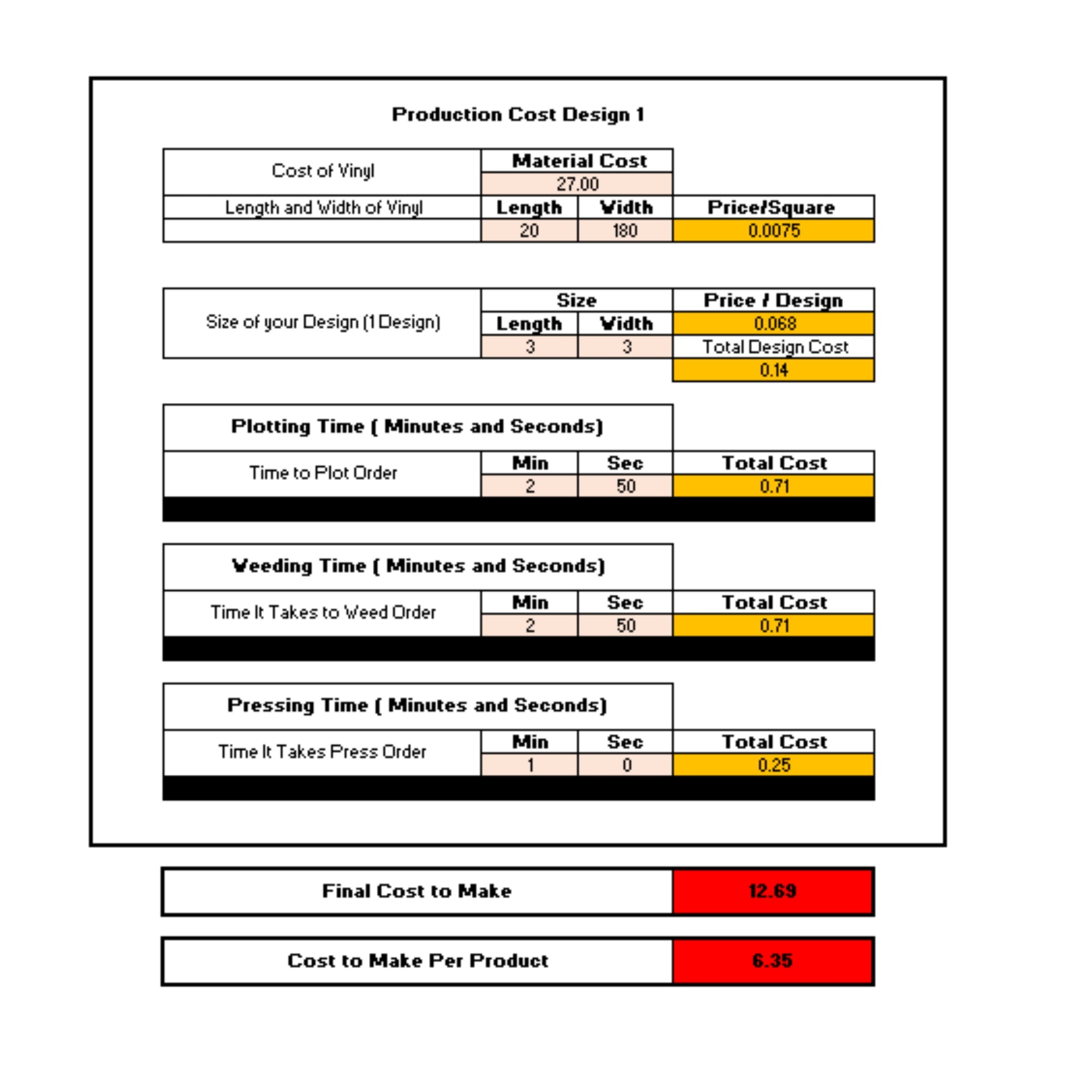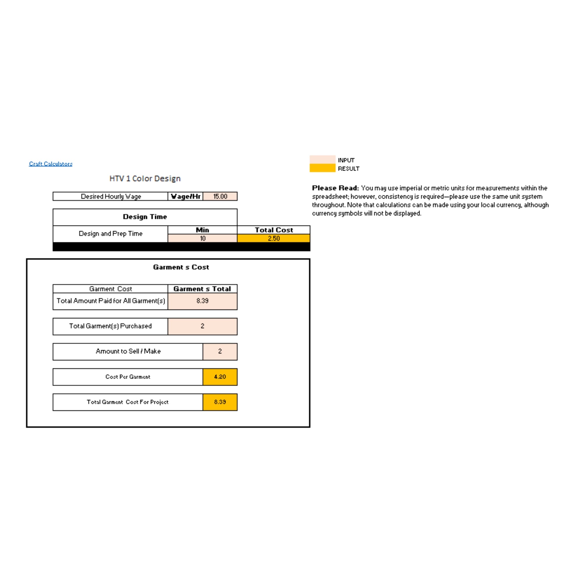 This calculator is designed to calculate the cost to make a single color heat transfer vinyl (HTV) product or project. Simply input all your production information, such as material and labor costs, and the calculator will provide the cost to make your 1-color HTV designs. It’s perfect for those who need accurate estimates for single-color vinyl projects.