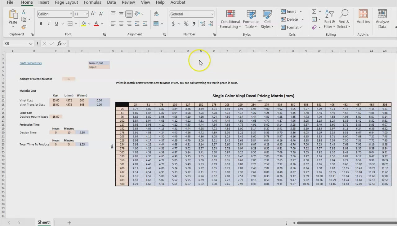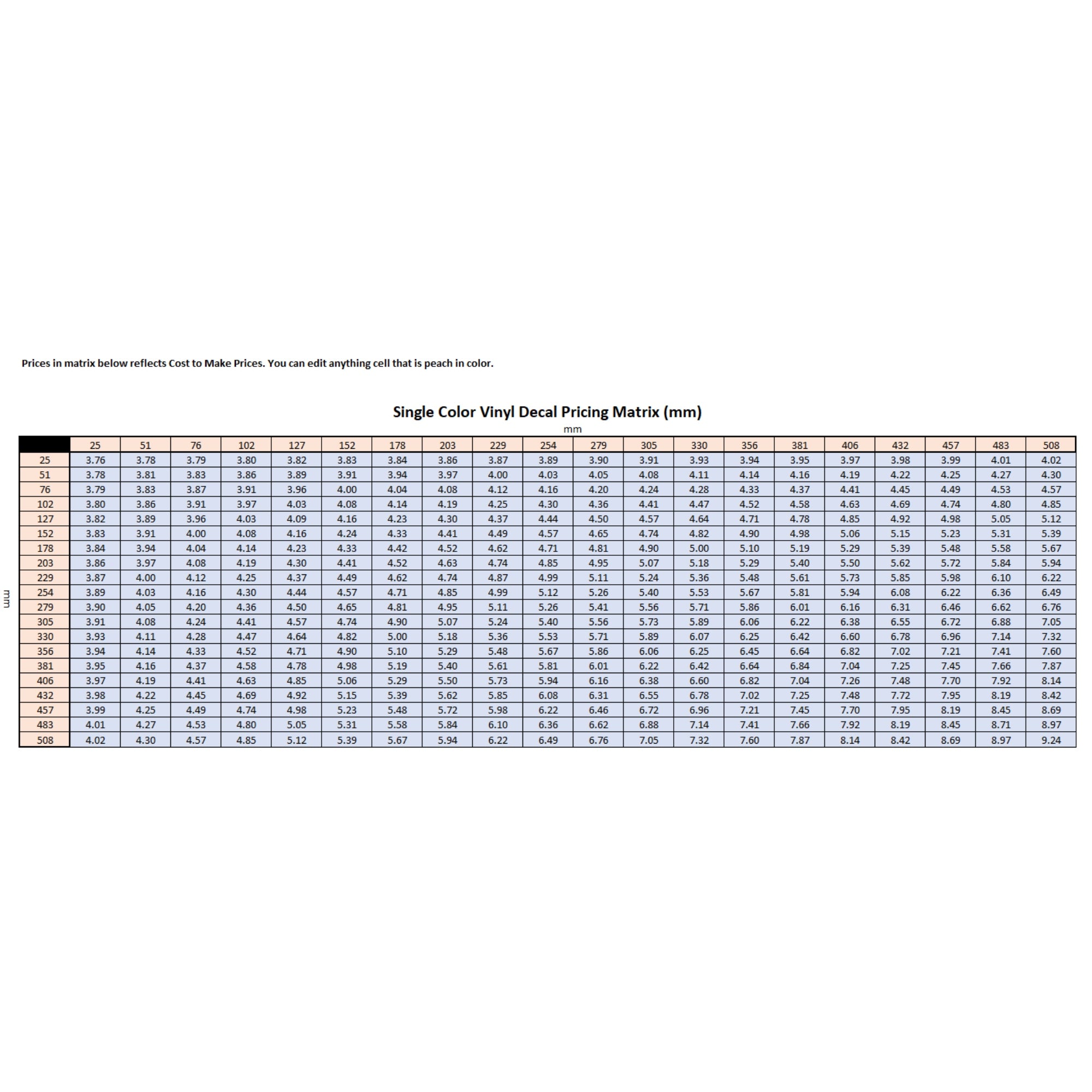 Vinyl Decal Pricing Matrix: Calculate Single-Color Vinyl Decal Costs in Millimeters (mm)