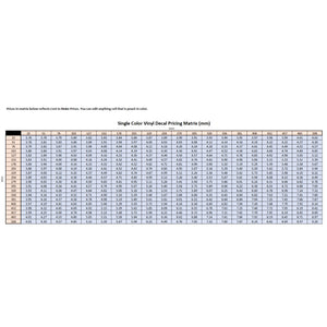 This pricing matrix is designed for single-color vinyl decals using metric units (millimeters).