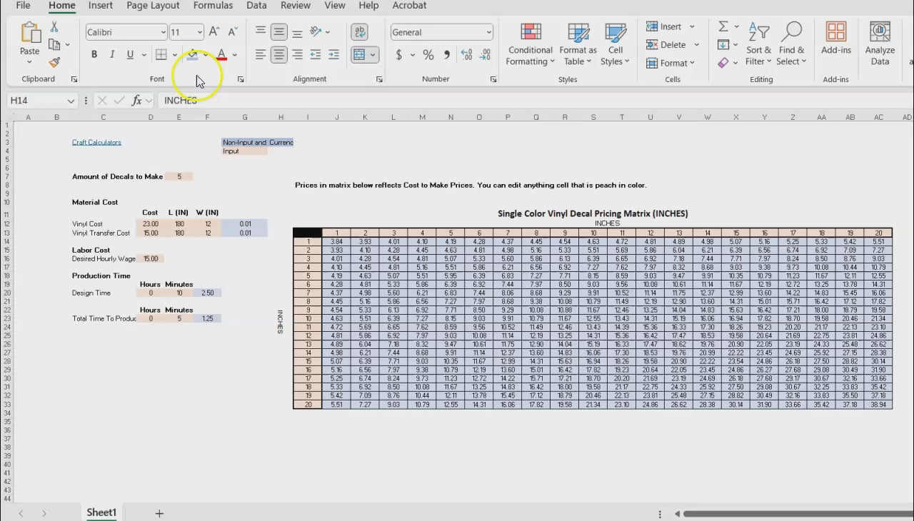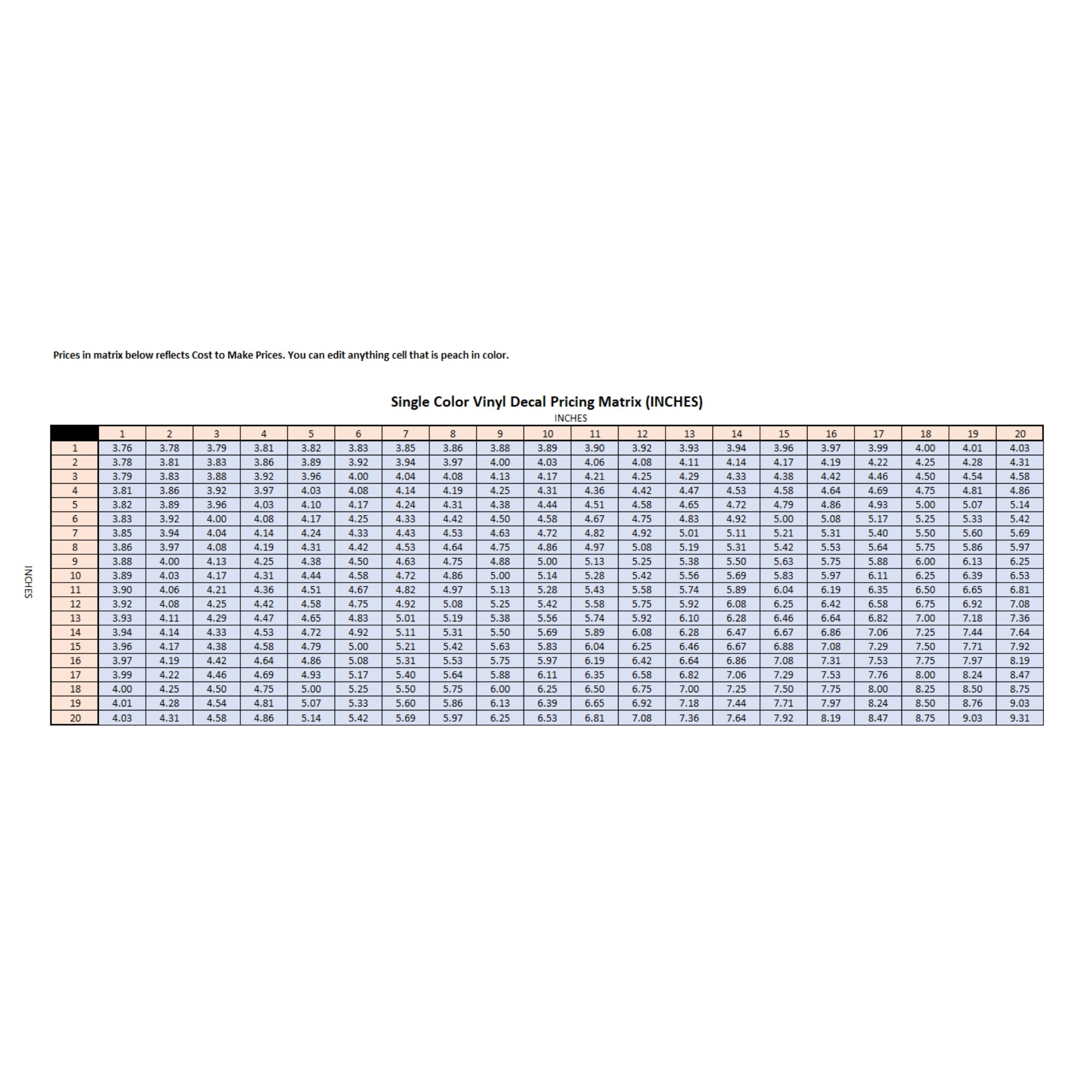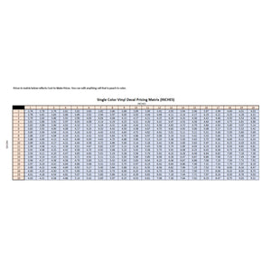 This pricing matrix is designed for single-color vinyl decals using imperial units (inches).